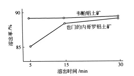 從圖中可以看出,韋帕鋁土礦的成分是三水鋁石和一水軟鋁石礦,在溶出條件下,5min就可達到最大溶出率,所以增加溶出時間對其溶出率不產生影響;也門的內哥羅鋁土礦的成分是一水軟鋁石和一水硬鋁石,它的溶出速率較慢,所以增加溶出時間能使氧化鋁的溶出率增加。
