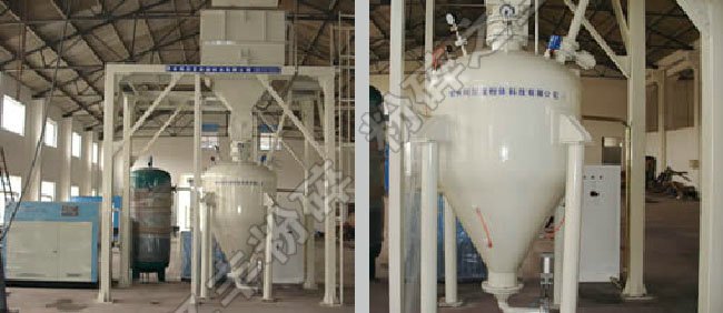 本裝置在發送罐錐體部分設有流態化裝置。流態化裝置由多個噴嘴組成,壓縮空氣進入流態化裝置促使物料充分形成渦流狀,致使物料充分流化,徹底輸送干凈。