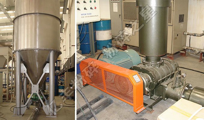 發送罐出口配置排料氣動插板閥,當物料由進料閥進入倉泵達到料位時關閉進料閥后進氣閥進氣使物料流態化,達到壓力設置值時由電接點壓力表開關發出信號開始輸送,大大提高輸送效率而降低耗氣量。