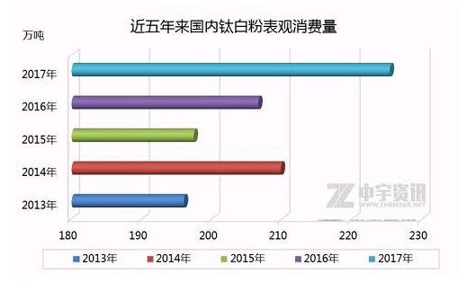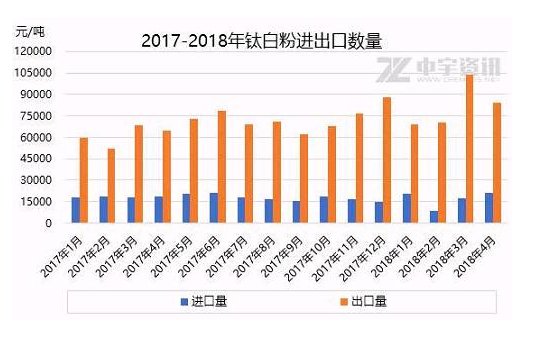 2018年4月份國內鈦白粉表觀消費量為17.7萬噸左右,環比減產23.4%。前四個月累計消費量為57.72萬噸。在供給側改革持續發力,環保督查形勢嚴峻的國內經濟環境下,國內鈦白粉需求偏弱,預計2018年國內需求不及去年。