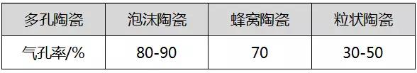 根據(jù)成孔方法和空隙,多孔陶瓷可分為:泡沫陶瓷、蜂窩陶瓷、粒狀陶瓷,其對應(yīng)氣孔率如下: