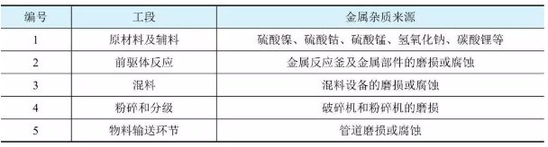 從表中可以看出,三元材料制備過程中金屬雜質的帶入點。