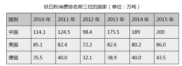 由此可知,目前中國已經成為全球第一大鈦白粉消費國。2013年,我國國內鈦白粉需求總量約175. 5萬噸。2015年,國內鈦白粉需求總量約200萬噸,年均增長率8. 4%,預計未來仍有較大的增長空間。