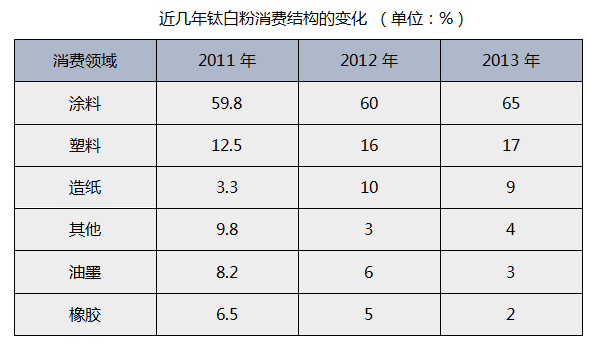 近幾年,鈦白粉的消費結構在發生變化,在涂料和塑料中的占比提高,造紙行業也有所增長,涂料、塑料和造紙仍是鈦白粉消費的三大主力。近幾年來,受歐洲綠色壁壘和美國反傾銷影響,國內輪胎出口受阻,鈦白粉在橡膠領域用量大幅度降低。