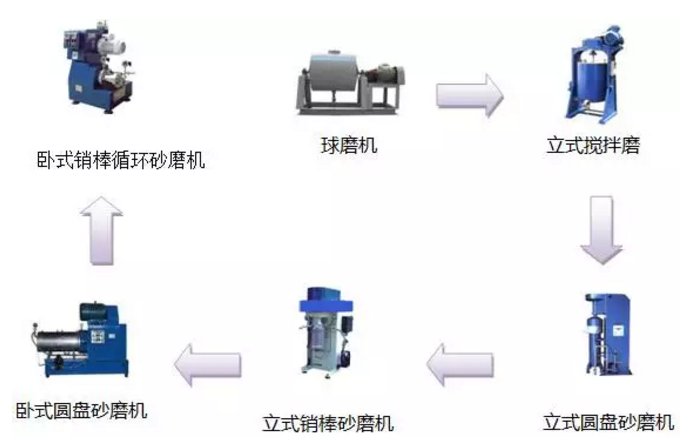 根據砂磨機的發展,可將其分為五個階段:立式攪拌磨、立式圓盤砂磨機、立式銷棒砂磨機、臥式圓盤砂磨機和臥式銷棒循環砂磨機。