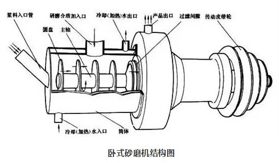砂磨機的結構主要由漿料桶、漿料泵、研磨腔體及轉動系統和冷卻系統組成。起到分散和研磨的主要部件為研磨腔體,由研磨容器、分散器、分離器及攪拌軸密封器等部分組成。