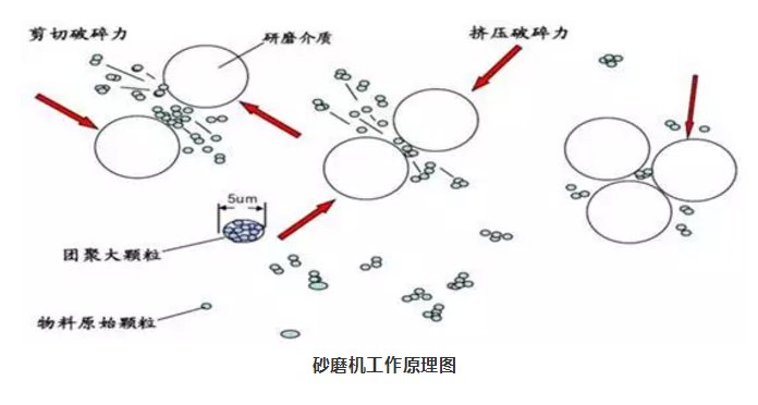 砂磨機的工作原理是利用泵將預先在漿料桶內經高速攪拌混合的漿料輸入密閉的研磨腔體內,與高速轉動的研磨介質接觸,從而使物料中的固體微粒和研磨介質相互間產生更加強烈的碰撞、摩擦和剪切作用,達到加快磨細微粒和分散聚集體的目的。從研磨腔體內流出的漿料回到漿料桶,再次重復前述分散過程。經過多次循環,達到要求的細度和很窄的粒度分布范圍。