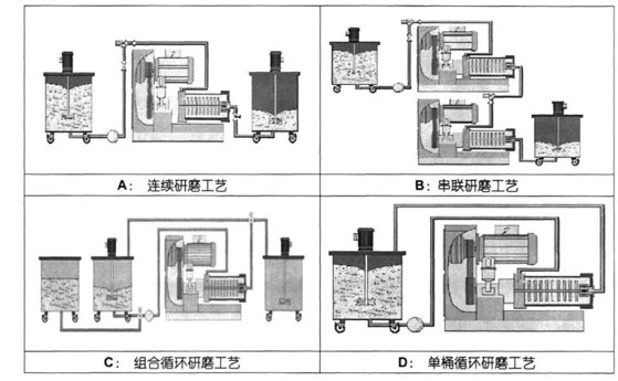 砂磨機的研磨工藝流程主要有四種,分別是連續研磨工藝,串聯研磨工藝、組合循環研磨工藝和單桶循環研磨工藝。單桶循環研磨工藝前提是循環次數大于5,循環桶上配有攪拌器,以保證物料充分混合,避免循環桶中的死角。該工藝操作簡單,設備投資小,一般用于陶瓷原料,如碳化硅、氮化硅、碳化硼等的研磨。