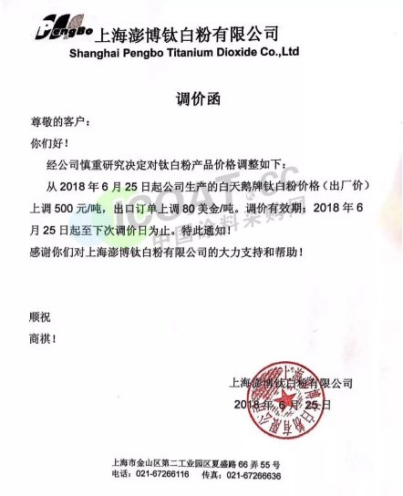 上海澎博鈦白粉有限公司發布調價通知稱,從6月25日起公司生產的天鵝牌鈦白粉價格(出廠價)上調500元/噸,出口訂單上調80美金/噸。調價通知如下: