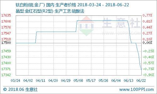 以國內市場走貨量較大的硫酸法金紅石型鈦白粉為例,據生意社大宗榜數據顯示,上周(6月18日-6月22日)鈦白粉總體平均價弱勢走低,從上周初的17500元/噸到周末的17366元/噸,降幅為0.76%。