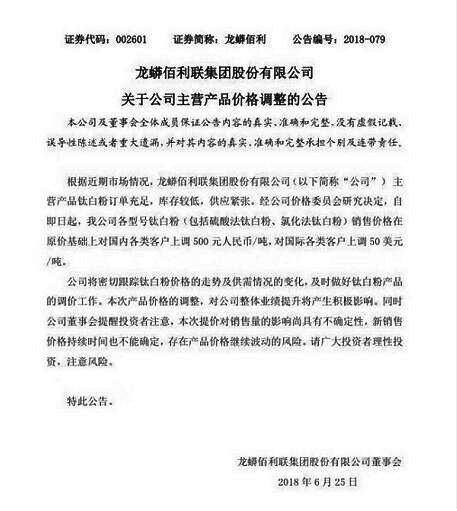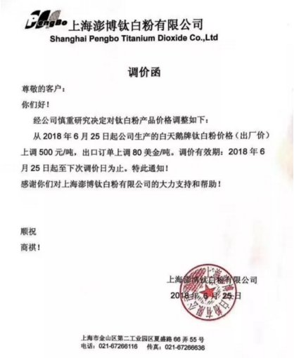 上海澎博鈦白粉有限公司發布漲價函,宣布自2018年6月25日起公司生產的白天鵝牌鈦白粉價格(出廠價)上調500元/噸,出口訂單上調80美金/噸。調價有效期:2018年6月25日起至下次調價日為止。