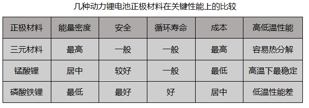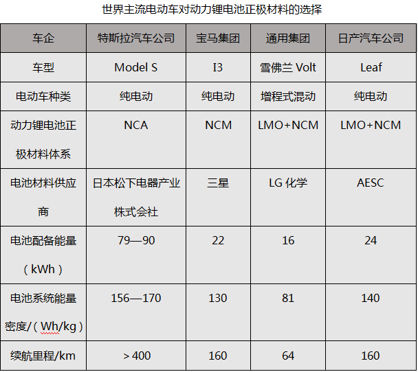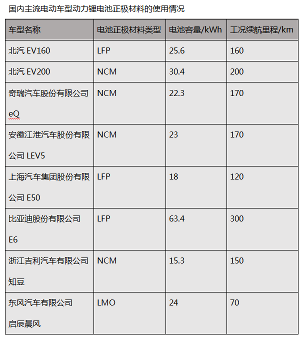 國內(nèi)主流電動車型動力鋰電池正極材料的使用情況