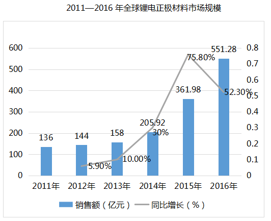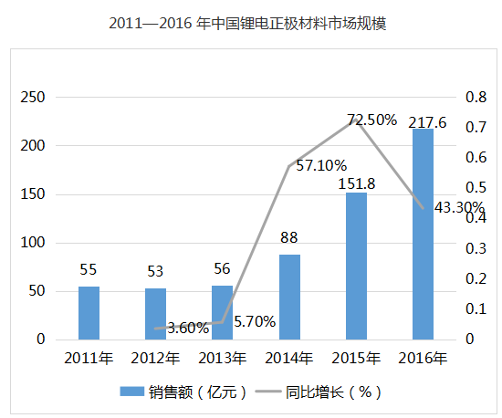 2014-2016年鋰離子電池正極材料呈現(xiàn)快速增長的態(tài)勢,2016年中國的鋰電正極材料產(chǎn)值達(dá)到217.6億元,較2015年同比增長43.3%,主要原因是我國新能源汽車市場的爆發(fā)性增長,帶動了動力型鋰電池需求的快速增長。