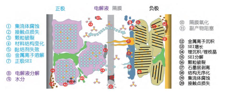 電池關鍵材料:正極材料的微裂紋與破碎、負極材料的破壞與表面SEI過厚、電解液老化、活性物質與集流體脫離、活性物質與導電添加劑的接觸變差(包括導電添加劑的流失)、隔膜縮孔堵塞、電池極耳焊接異常等。