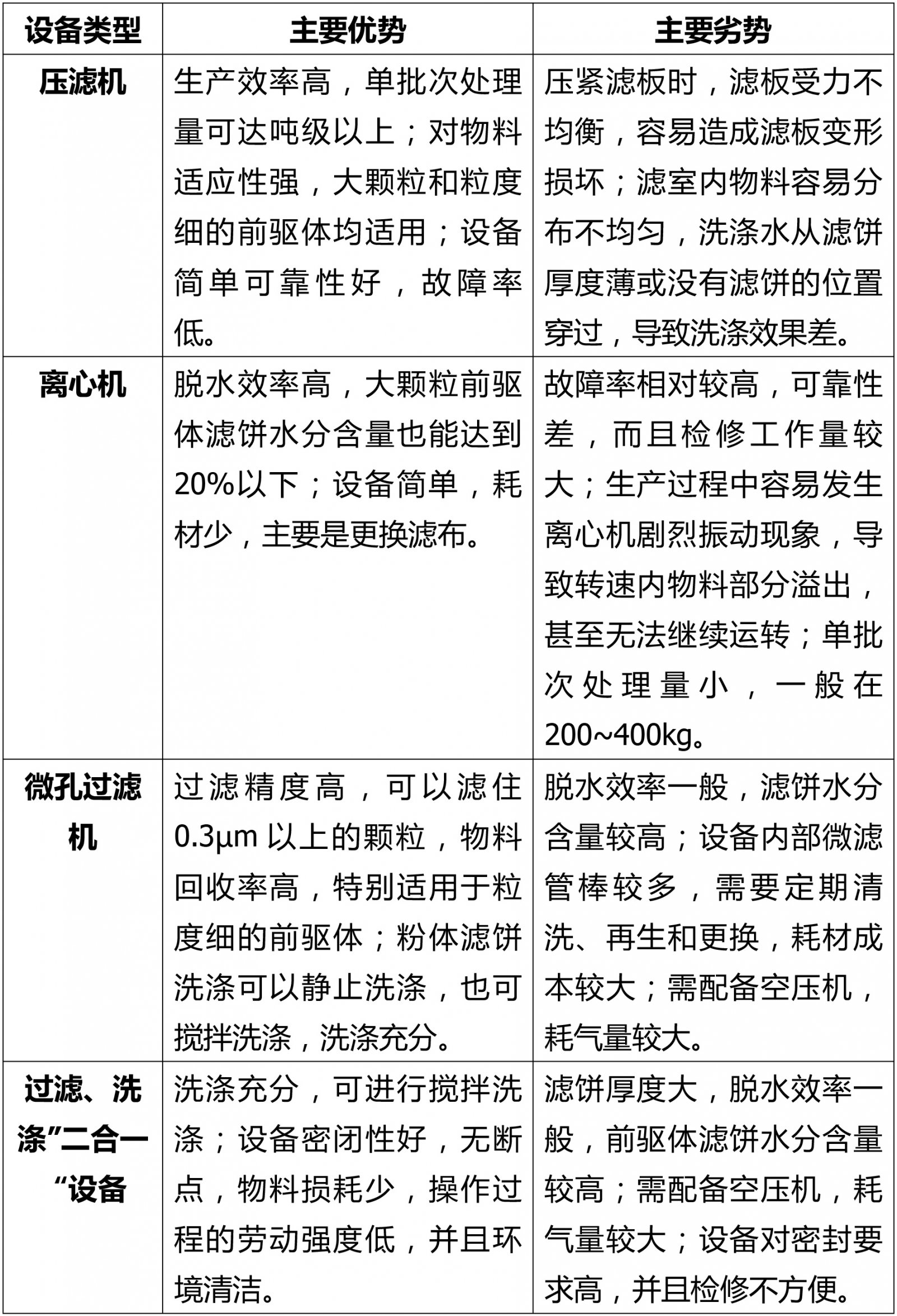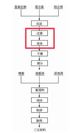 過濾和洗滌設備是將反應得到的前驅體漿料實現固液分離,然后采用洗滌液對得到的前驅體濾餅進行洗滌,去除殘留在濾餅中的硫酸根、氯根、鈉離子等。