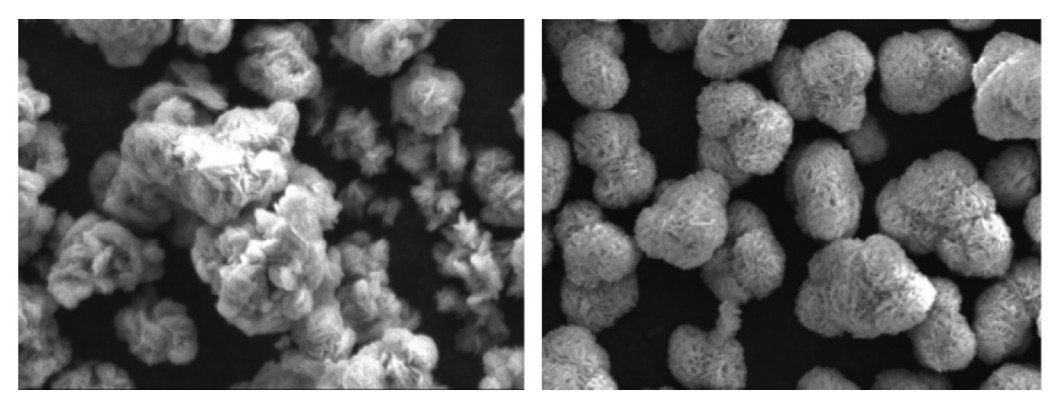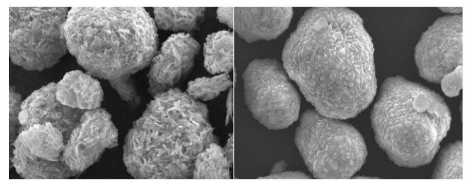 圖3:不同氨濃度高鎳前驅體產品的SEM圖(左:氨含量:2g/L,右:氨含量:7g/L)