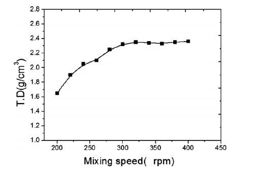 攪拌速度對晶體結晶過程影響較大,從而影響前驅體的振實密度。