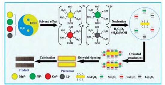 Ma等采用一步法草酸共沉淀制備錳基三元材料的過程中發現,通過在純水體系中混入乙醇,可以改變溶液的電介質常數,從而改變溶質、溶劑間的相互作用力,降低晶體成核阻礙,加快Ni2+、Co2+和Mn2+與草酸沉淀反應的進行。