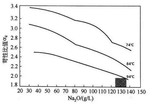 稀釋漿液溫度升高,其黏度和密度下降,因而赤泥沉降速率加快。漿料稀釋時的溫度在很大程度上影響鋁酸鈉溶液的穩定性,從而引起赤泥中氧化鋁損失量的變化。由下圖可知,為使較低濃度及低苛性比值的鋁酸鈉溶液在稀釋后保持其穩定性,必須將溶液溫度提高到94℃以上。