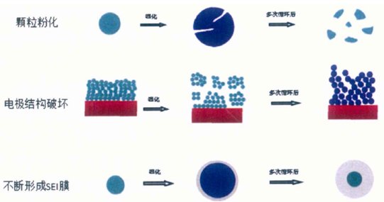 但是硅基負極材料同樣存在很大缺點。硅脫/嵌過程中有較大的體積變化(300%),易導致顆粒粉化,進而從集流體上脫落。同時,硅負極表面在充放電過程中存在 SEI 膜的不斷破碎及生成,持續地消耗活性鋰離子,導致庫侖效率及電池循環壽命降低。