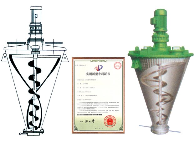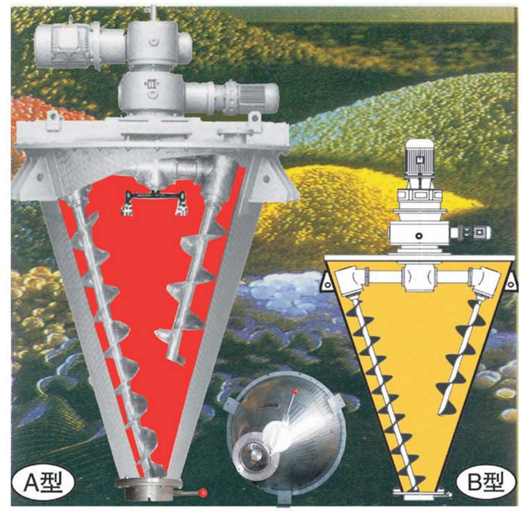 由傳動機構、錐形筒、外層螺帶攪拌器、內層反向螺桿攪拌器和出料閥組成。