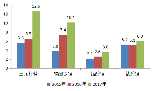 2017年鋰電池正極材料總產量增長超過50%,三元材料產量首次超過了磷酸鐵鋰,成為產量最大的正極材料。