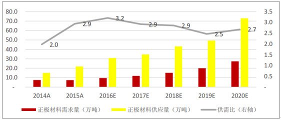 從2017年開始,多家企業開始布局正極材料項目,新增產能將集中在2018-2019年間投產。據預計,到2020年我國正極材料總產能將突破70萬噸,而需求量則約26.4萬噸;到2020年我國三元正極材料總產能預計為28.4萬噸,三元正極材料需求量為12.6萬噸。正極材料產能過剩較嚴重,三元正極材料產能過剩程度略低,而且高端產品如高鎳產能如811、622等,預計有望成為稀缺產能。