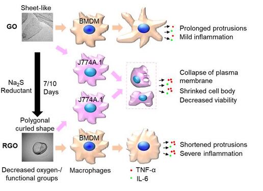 作為極具應(yīng)用前景的碳納米材料,石墨烯類納米材料在環(huán)境、生物醫(yī)學(xué)和能源等領(lǐng)域得到越來越多的開發(fā)和應(yīng)用。目前對于石墨烯類納米材料的環(huán)境健康風(fēng)險已展開了很多研究,但是對于此材料在環(huán)境介質(zhì)和生物介質(zhì)中的轉(zhuǎn)化過程及此轉(zhuǎn)化過程對其生物效應(yīng)的影響了解甚少。為了揭示這個科學(xué)問題,該課題組系統(tǒng)探索了氧化石墨烯(graphene oxide,GO)在環(huán)境介質(zhì)和體內(nèi)肺生物介質(zhì)中的轉(zhuǎn)化過程和毒性變化。該研究發(fā)現(xiàn)在環(huán)境介質(zhì)中還原劑的作用下GO發(fā)生顯著的還原并轉(zhuǎn)化為還原態(tài)氧化石墨烯(reduced graphene oxide,RGO),GO與RGO具有不同的含氧官能團(tuán)并表現(xiàn)出顯著不同的賦存形態(tài),最終導(dǎo)致對巨噬細(xì)胞產(chǎn)生顯著差異的毒性效應(yīng)(圖3)。相關(guān)成果發(fā)表于Nanoscale。該課題組也揭示了GO在肺內(nèi)生物介質(zhì)中的轉(zhuǎn)化過程與毒性及相關(guān)功能變化,研究成果發(fā)表于NPG Asia Materials和Nanotheranostics。