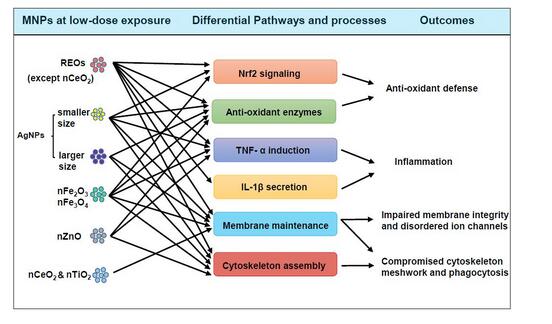 圖2. 金屬納米材料誘發(fā)巨噬細(xì)胞不良結(jié)局和相關(guān)毒性通路差異的示意圖