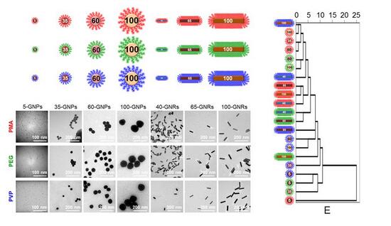 圖1. 21種具備多維度物理化學(xué)性質(zhì)AuNPs生物行為與效應(yīng)異同的聚類分析種具備多維度物理化學(xué)性質(zhì)AuNPs生物行為與效應(yīng)異同的聚類分析