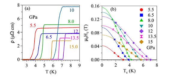 圖5. (a)黑磷單晶的超導(dǎo)轉(zhuǎn)變隨壓力的演化關(guān)系;(b)超導(dǎo)轉(zhuǎn)變臨界場隨壓力的變化關(guān)系。