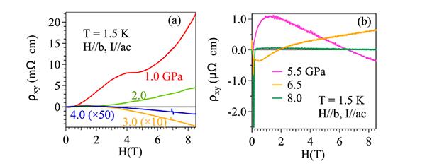 圖4. 黑磷單晶在1.5K不同壓力下的霍爾電阻ρxy隨磁場的依賴關(guān)系。
