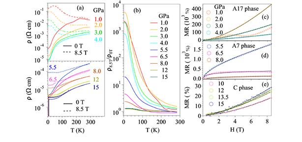 圖2. (a) 黑磷單晶在不同壓力(1-15GPa)和不同磁場(0T, 8.5T)下的電阻率隨溫度的依賴曲線;(b)歸一化的磁電阻隨溫度的依賴關(guān)系;(c)黑磷的高壓相在1.5K時(shí)的磁阻隨磁場的變化關(guān)系。