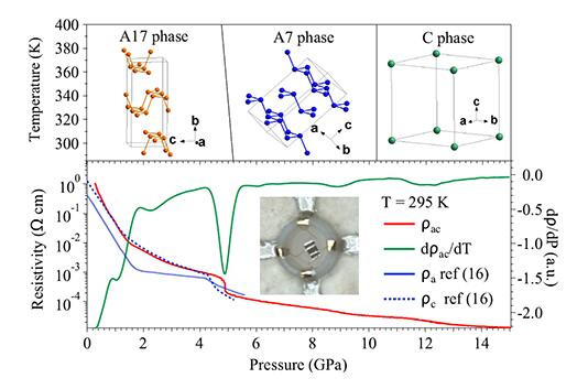 圖1. 黑磷單晶的結(jié)構(gòu)相變與電阻的壓力依賴關(guān)系。