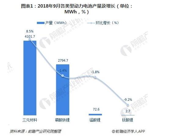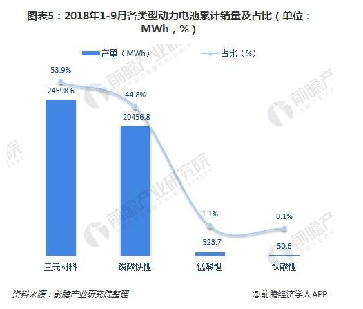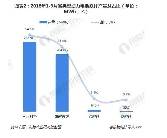 2018年前9個月動力電池累計產量達46.0GWh,其中三元電池累計生產24.9GWh,占總產量比54.1%;磷酸鐵鋰電池累計生產20.4GWh,占總產量比44.4%;錳酸鋰電池、鈦酸鋰電池占比不到2%。