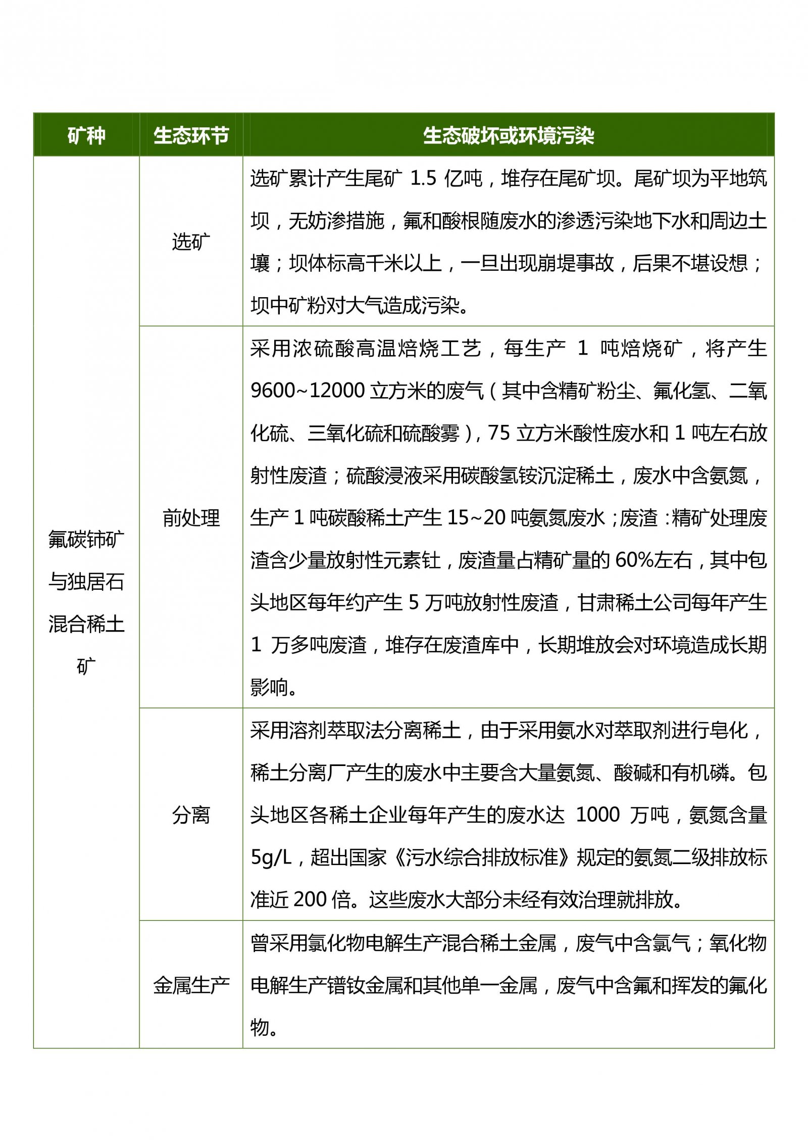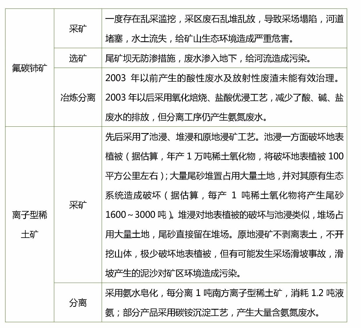 過量開采導(dǎo)致土地、植被破壞、水土流失,影響生態(tài)環(huán)境,遇到雨水沖刷,覆蓋下游河床與田地,嚴重污染水源;稀土煉及加工過程中排放大量的“三廢”。