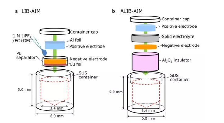 其中LIB表示鋰離子電池(lithium ion battery),ALIB表示全固態鋰離子電池(all-solid-state LIBs),AIM表示all-Inclusive microcell。在鋰離子電池的DSC分析中,為了防止正負極短路,負極是卷含在PE隔離膜中的;而在全固態電池的DSC分析中,并沒有使用Al箔和Cu箔,且將組裝好的組分是放置在Al2O3管中以防止短路。
