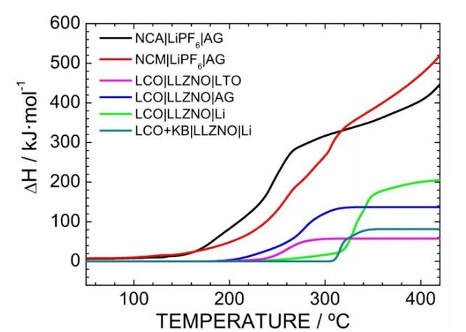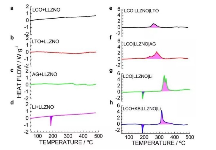 圖3全固態鋰離子電池DSC分析結果。溫度范圍為25℃-480℃,升溫速率為5℃/min。所有樣品均含LiPF6(EC/DEC)電解液。其中AG表示人造石墨(artificial graphite),LCO為鈷酸鋰,LTO鈦酸鋰,LLZNO為鈮摻雜鋰鑭鋯氧固態電解質。