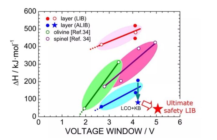 作者根據DSC測試結果(截至420 ℃)和工作電壓窗口繪制了圖4?梢钥闯,即使使用不同的電解液或固態電解質,全電池反應焓同正極材料的工作電壓正相關。全固態電池產熱量只有鋰離子電池的25-30%,因此具有顯著的安全性優勢。盡管KB的加入使反應焓降低至16%左右,但放熱量依然存在,這也表明現有的固態電池還無法做到絕對安全。因此,依然需要努力將放熱量進一步降低,實現真正意義的“安全”。同時作者也建議要結合DCS和ARC深入研究鋰離子電池和全固態鋰離子電池的熱穩定性問題。