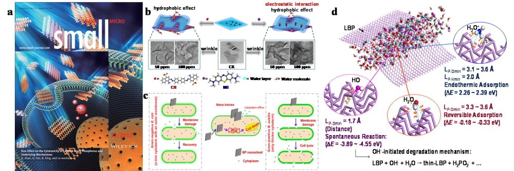 圖a. 二維黑磷細胞毒性評價;b.二維黑磷吸附離子型化合物機理圖;c.二維黑磷對細菌毒性機理;d. 二維黑磷與氫氧根反應降解機理圖。