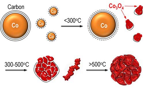 利用等離子體電弧法制備碳包裹金屬單質Co的復合殼核結構(Co@C納米膠囊)。此工作主要利用C與Co的氧化燃燒溫度不同,Co優先氧化成Co3O4納米顆粒,且生成的Co3O4由于其密度小于Co顆粒,其體積迅速膨脹,在碳外殼的壓力作用下產生納米限域效應,在此效應的作用下使新成生的Co3O4納米顆粒產生高應力梯度,從而誘導Co3O4納米顆粒產生高指數晶面與高缺陷表面,從而出現具有豐富的催化活性位與高能態的高指數晶面,實現提高納米顆粒催化性能的目的。