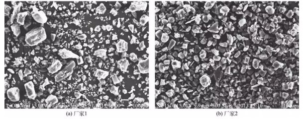 各個廠家產品的粒度差別較大,下圖為廠家1和廠家2生產的單水氫氧化鋰產品SEM圖。從圖中可以看出,廠家2的產品粒度均一性較好,并且沒有較大顆粒存在。不過粒度越小的氫氧化鋰其產品價格相對較高,且對混合設備的密封性要求高,各三元生產廠家應根據自身需求選擇合適的氫氧化鋰產品。