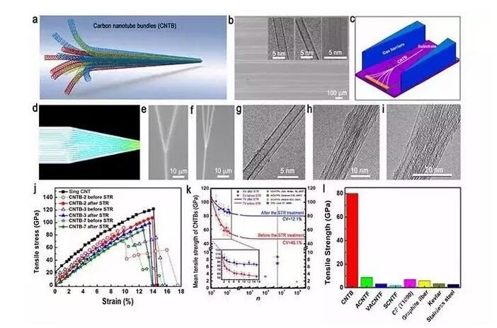 a.碳納米管管束示意圖;b. 所用到的超長碳納米管的結構;c. 利用氣流聚焦法制備超長碳納米管管束的示意圖;d. 超長碳納米管在聚焦氣流下發生合并的模擬圖;e-i. 所制備的具有確定組成的超長碳納米管管束;j-k. 所制備的碳納米管管束的力學性質;l. 超長碳納米管管束與其他材料拉伸強度對比圖