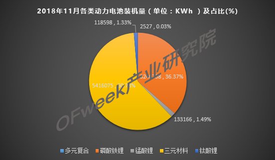 從車輛細(xì)分類別來看,2018年11月,我國新能源乘用車動(dòng)力電池裝機(jī)量約為5.41GWh,占比60.73%,新能源客車動(dòng)力電池裝機(jī)量約為2.24GWh,占比25.13%,新能源專用車動(dòng)力電池裝機(jī)量約為1.26GWh,占比14.13%。