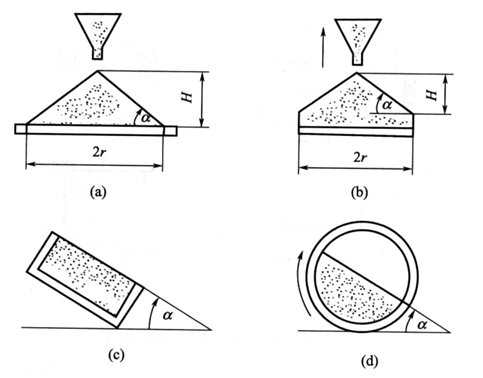 休止角的測定方法主要有3種(見圖 2),即注入法、排出法和和容器傾斜法。