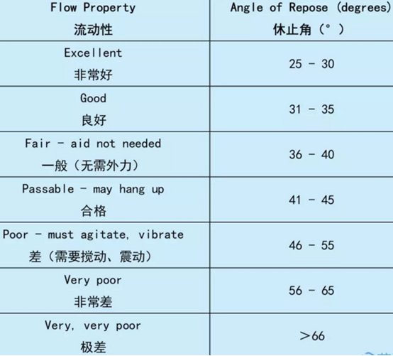 休止角是檢驗粉體流動性的好壞的最簡便的方法。一般而言,休止角越小,摩擦力越小,粉體的流動性越好。如果粉體的休止角α<30o,其流動性好;若粉體的休止角α>40o(或45o),則流動性差,需采取措施保證分劑量準確。但在實際生產中,休止角α<40o就可以滿足分劑量的生產要求。