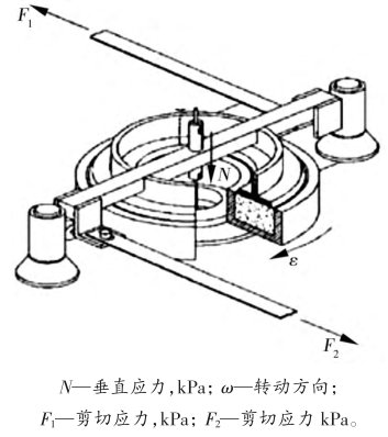 環形剪切實驗法與 Jenike 剪切法不同,剪切盒呈現環形,如圖6所示,在粉體的上部施加垂直應力,然后旋轉下部剪切盒,環形的粉體層發生剪切旋轉,測定力矩即可求得剪切應力。