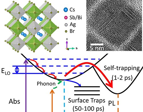 該團隊研究人員合成出Cs2AgSbX6(X:Br,Cl)雙鈣鈦礦納米晶,其中,Cs2AgSbBr6納米晶作為一種新型雙鈣鈦礦屬首次報道。該結果表明開發新型雙鈣鈦礦的納米晶是得到新型材料的有效途徑,并對后續開發具有指導作用?蒲腥藛T采用飛秒瞬態吸收光譜研究其激發態載流子動力學機理,發現在Ag-Sb雙鈣鈦礦納米晶中存在強烈的電荷-聲子耦合效應,可形成自陷態捕獲自由激子。此外,該雙鈣鈦礦納米晶在多激子相互作用下表現出緩慢的熱載流子冷卻過程,表明該材料有用于熱載流子光電子器件的潛質。