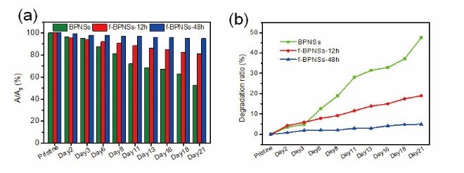 圖2. f-BPNSs以及原始的BPNSs在水中放置21天后460 nm處的吸光度的衰減值(a)以及衰減速率(b)