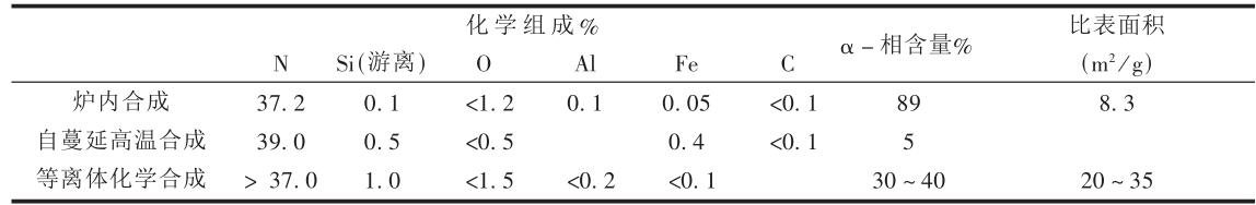 氮化硅粉體對最終陶瓷制品的性能有重要影響,而氮化硅粉體的基本性能取決于其合成方法和初始反應(yīng)劑的質(zhì)量。下表是不同合成方法制得的氮化硅粉體的基本特性。